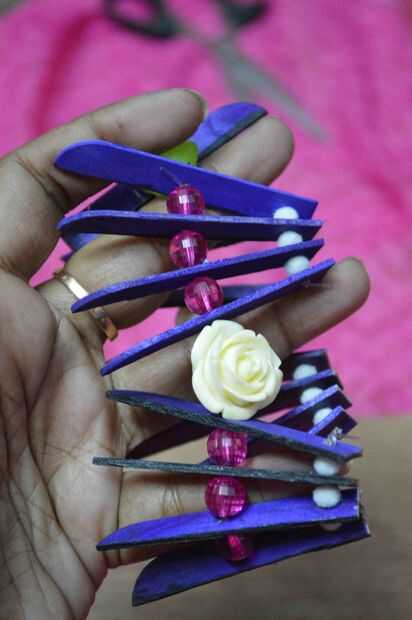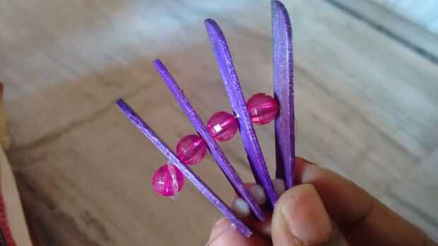 * Después de haber moldeado las perlas rosa, inserte otro grano de diferente color y tamaño (formada hexagonal verde rosa grano granos). No cortar la cadena elástica.