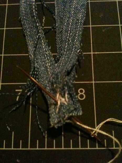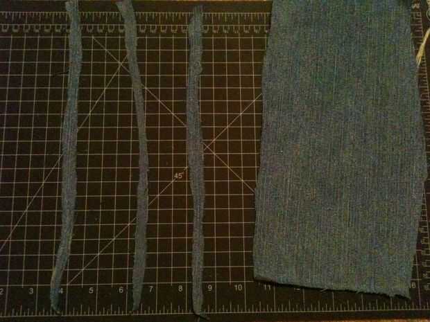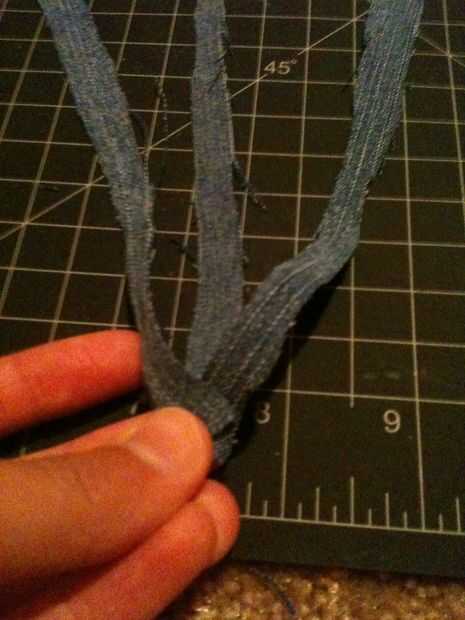 Tomar su segmento de jean azul y cortar un rectángulo de largo. Mina fue aproximadamente 11 pulgadas de largo. No importa el ancho. Estará cortando 3 tiras largas y estrechas de este rectángulo para usar para la pulsera. El resto de la mezclilla se puede guardar para futuros proyectos. Una vez que tengas tus franjas, agarra un extremo de cada uno y alineados entre sí. Después de que se alined, coser los extremos que tenéis juntos.