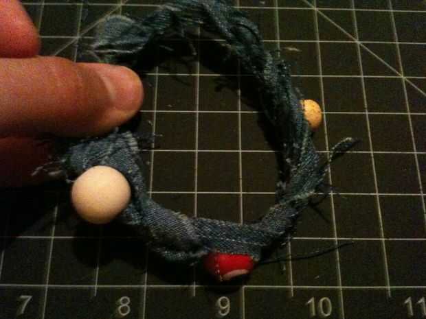 Para terminar la pulsera, figura hacia fuera cómo es grande o pequeño quieras que sea. Debe ser suficientemente grande como para deslizarse fuera de su muñeca y volver fácilmente. Una vez han averiguado exactamente cómo te gustaría ser, mantener los 2 extremos de la pulsera juntos. Coserlas fuertemente y con seguridad.