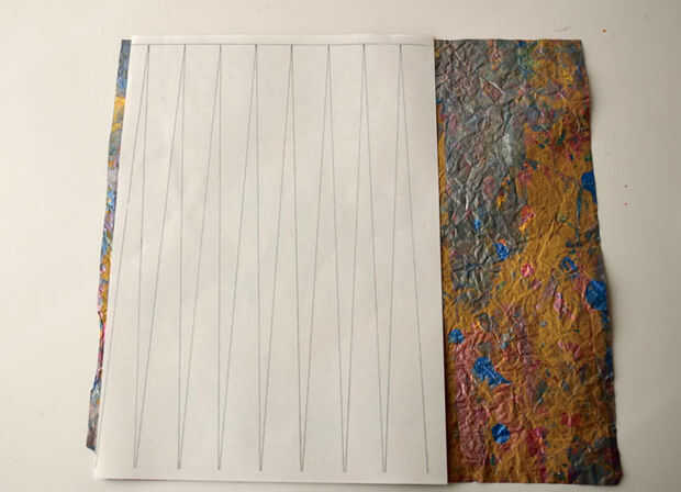 Tomar la tela de papel marrón alisada y una plantilla de bolas cónicas de 1 pulgada. Si no tienes una plantilla, usted necesitará medir algunos triángulos en la parte posterior del papel. Para ello, medir secciones de 1 pulgada a lo largo de un borde y, a continuación, las secciones de media pulgada enfrente de, a lo largo del borde superior. Utilizando una regla, dibuja líneas para crear triángulos largos todo el ancho del papel.