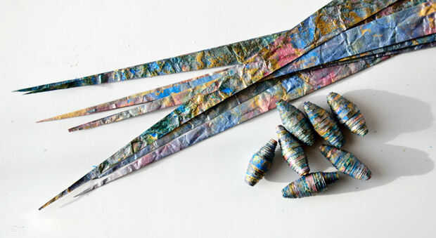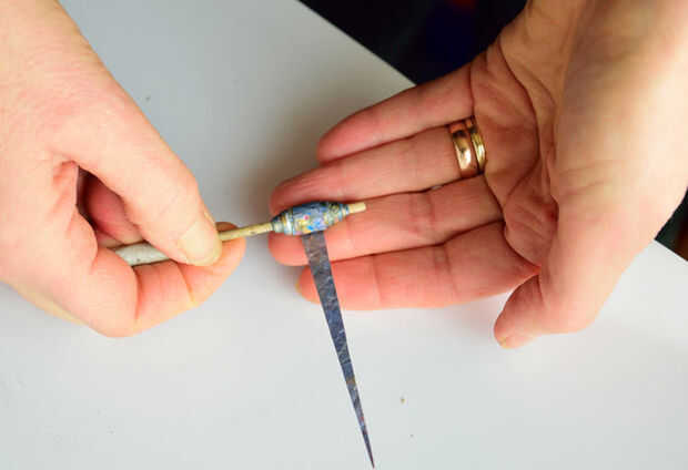 Mi herramienta balanceo casero es similar a muchos a la venta en línea. Tiene una tira extraíble grande en un extremo y un fijo en la manija de papel en el otro. Simplemente quitar el grano, deslice mi tira de papel en su lugar y comenzar a rodar bastante bien hasta que el bien está atrapado. Antes de que llegue demasiado lejos en el bobinado, que eliminar el grano y luego mueva suavemente la tira de papel hacia abajo más cerca de la punta de la herramienta para facilitar la extracción una vez que está completamente cargado. Práctica hace perfecta y una vez que realmente está haciendo, es bastante intuitivo de todos modos. Tipo de 'sentir' su camino con las perlas.
