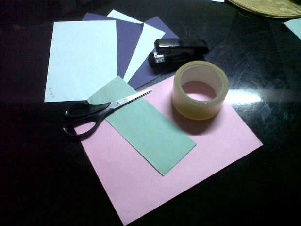 Color de papel del tamaño (1) 28 x 21 cm(pink) (2) 4 piezas de tamaño 20 x 14 cm (verde y violeta) (3) 20 x 15 cm(yellow), 2 cintas de length27 cm, un par de tijeras, cinta de Cello, grapadora.