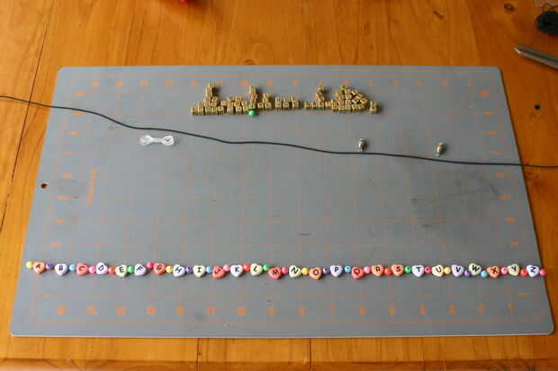 Desea diseño sus cuentas en el orden que quieres en tu pulsera/collar. Esto le dará una idea de lo que se ven como y cuánto será. Determina la longitud de mi pulsera de ocho pulgadas y la longitud del collar diecisiete pulgadas. Los granos de oro para la pulsera salió a ser el tamaño correcto. El corazón en forma de perlas para el collar necesita granos más, así que puse los granos esféricos coloreados, que viene en su paquete, entre cada corazón en forma de grano.