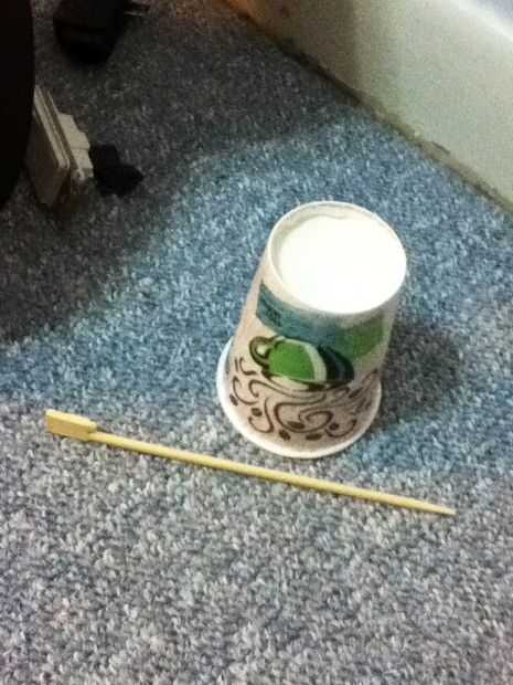 Tomar tijeras y haga un orificio en ambos lados de la copa para el palillo pasar. El palillo se asemeja a los brazos.