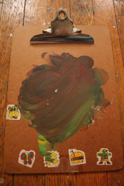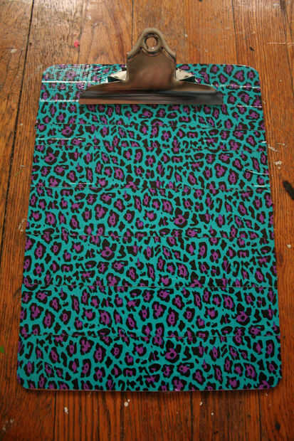 En primer lugar, pintar el portapapeles o cubrirla con un trozo de papel de scrapbook o cinta adhesiva. Usé cinta de conducto marca pato. Asegúrese de que usted elige un diseño que se complementan con los imanes de la carta, y también quiere ver las letras.