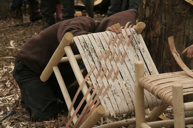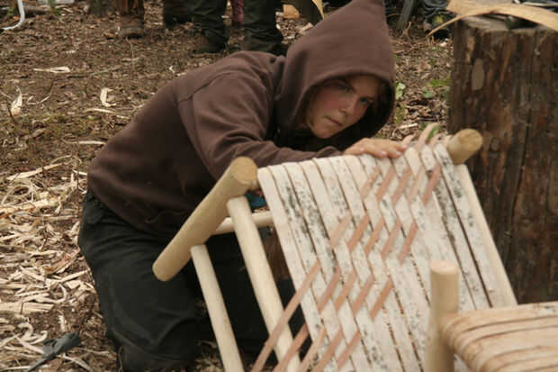 Una serie de tiras de tejido a través de la urdimbre (se trata de la trama). El patrón, la orientación y el ancho son una cuestión de preferencia. Mayoría de los participantes eligió a tejer sobre uno y bajo otro, pero patrones más complejos son posibles. Más también se utiliza una anchura de banda. Muchas personas creadas color contraste alternando lado fue para arriba. Si la deformación es demasiada será difícil tejer la trama. Si es difícil tirar de la corteza a través de la urdimbre, pruebe a cortar los extremos a un punto, frotar los extremos con cera blanda, o tirando de los extremos a través de con un palo aplanado (fid). Mayoría de los participantes volver a tejió una segunda capa de tiras de corteza más estrechas al doble la fuerza de apretar las cosas y crear una trama más interesante.