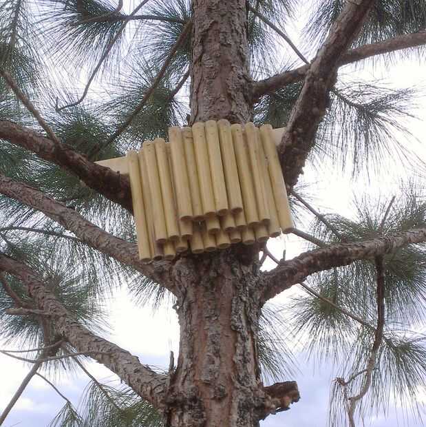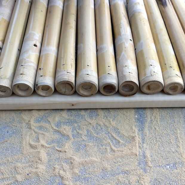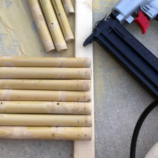 Yo estaba tratando de encontrar la mejor configuración y subió con un tipo de pirámide de construcción al revés. Sobresale por la parte superior de cada fila de la fila inferior. Esto proporciona protección del sol y la lluvia. Comencé por separar el bambú por su longitud. Para proporcionar una base, utilicé un trozo de 1 x 2. Había clavado el bambú más largo primero. Clavado es la forma más rápida pero el pegamento caliente es lo que voy a utilizar en el futuro. Los clavitos no dividirá el bambú si clavo cerca de las crestas o "nodos". Utilicé el siguiente más pequeño en longitud para la siguiente fila y así sucesivamente. 1 x 2 quedó más largo en los extremos para ayudar a asegurar a una rama de árbol o tocón.