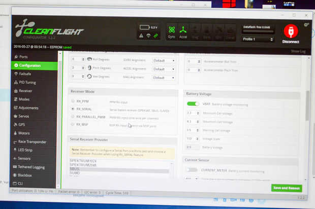 - En la página de configuración seleccionar modo Reciver - RX_SERIAL, Serial Reciver proveedor - SBUS