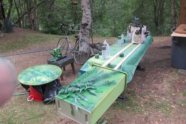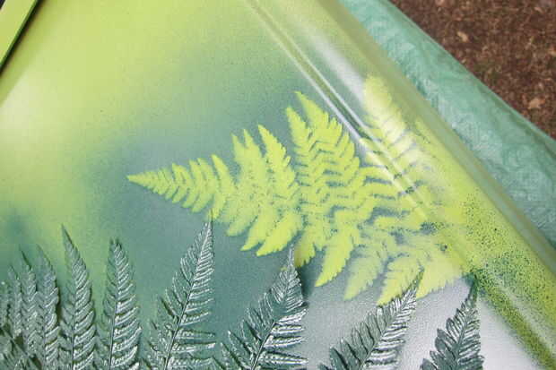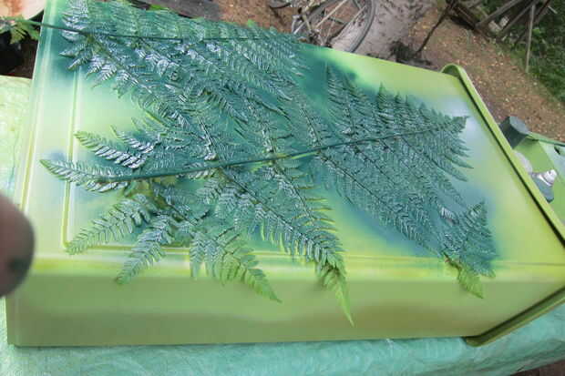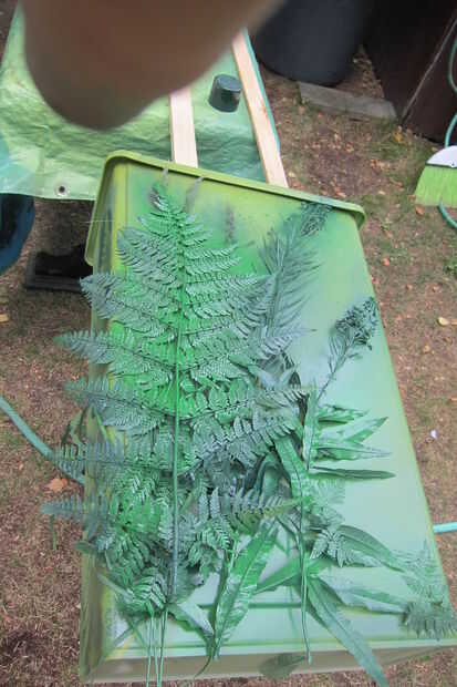 Escoge otro color pintura en aerosol y spray alrededor el follaje de 10 pulgadas.   No lo suficientemente cerca que el sray sopla las hojas alrededor.     Cuando han cubierto todo poco a poco dejarla secar.      Volver más adelante y agregar algunos más follaje (derecho encima y superposición de la primera).  Utilizar otro color (podría ser uno de los primeros colores que usaste si quieres.        Si eres atrevido y cuidado usted puede sacar las hojas mientras que las cosas aún se encuentre húmedas.    Si usted es paciente puede esperar hasta que las cosas son un poco secas.     Esta es su opción para hacer.