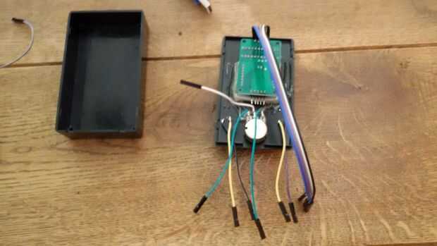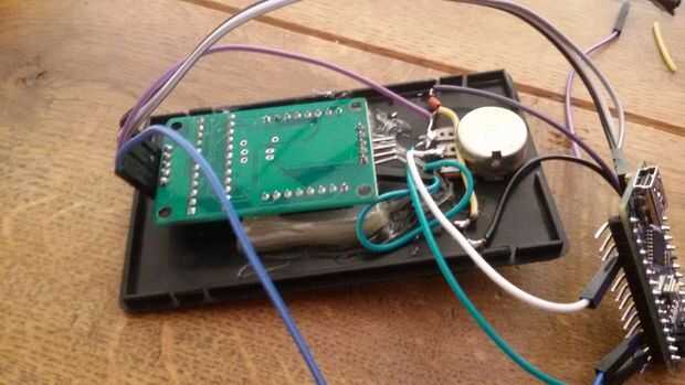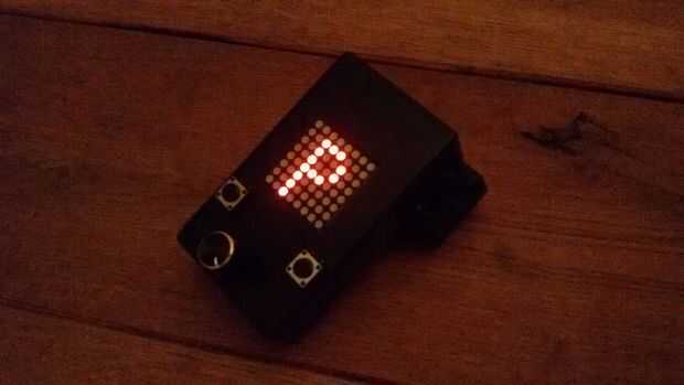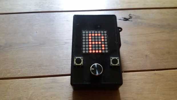 Empecé con un pequeño recipiente de plástico. La tapa se forma la matriz de LED y los botones y marcar. Hice un agujero cuadrado en ella y caliente-pegado a la matriz de LED fijada. Yo intercambiar el Arduino Uno con un Nano y tuve que doblar patas el Nano para que se ajuste el contenedor. Usé un montón de pegamento caliente para evitar que los pasadores de acortamiento con ninguna parte metálica dentro del contenedor. Los botones son caliente-pegado al caso así y el potenciómetro encajaría muy bien a través de un orificio perforado de M6.