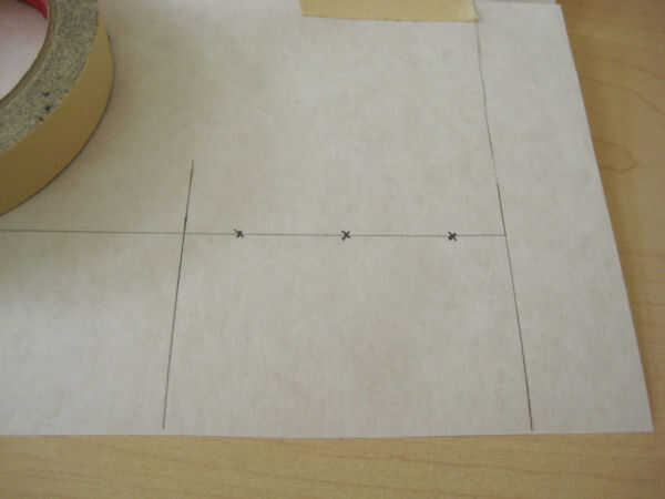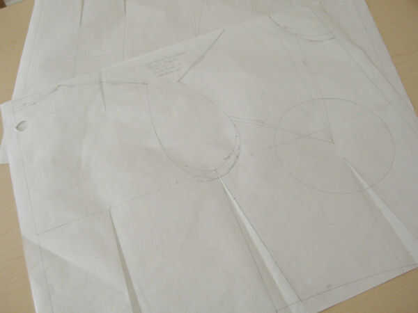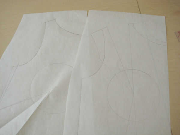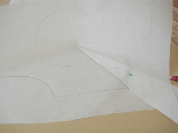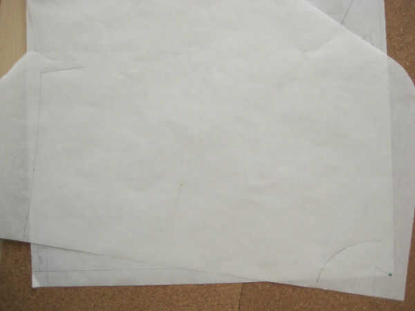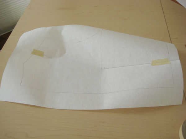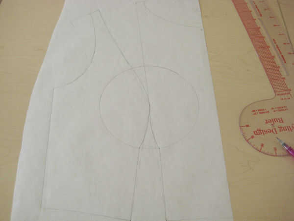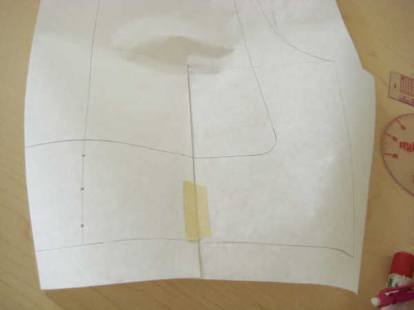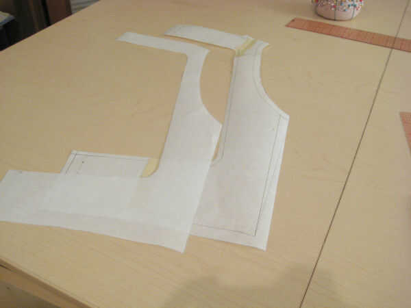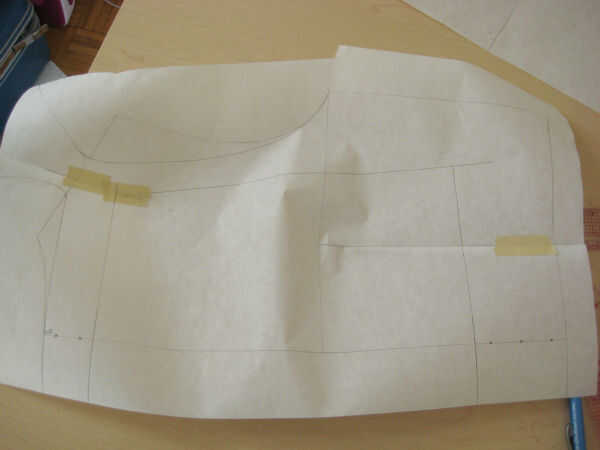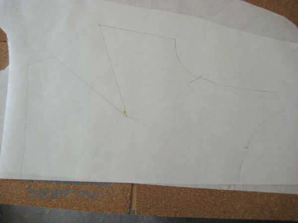 En primer lugar, decida donde quiere el dardo (plenitud) a. Decidí poner mi plenitud en un dardo de francés que termina 2" arriba de la cintura en la costura lateral. Coloque varios paneles de corcho hacia fuera y poner el bloque en la parte superior del corcho. Coloque papel de patrones frescos encima del bloque y traza la línea de centro delantero (CF).