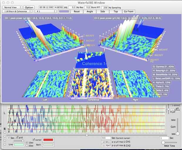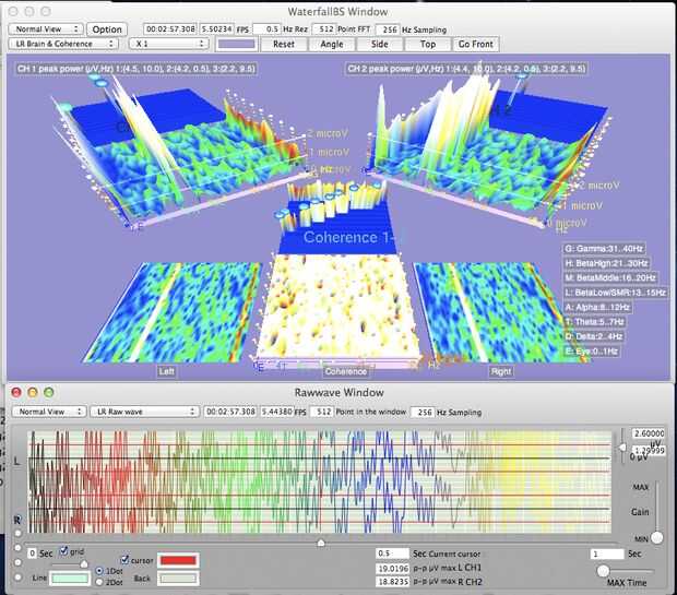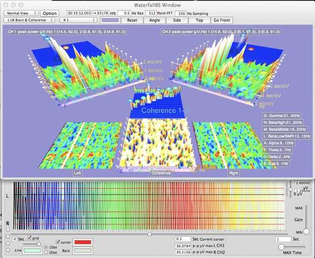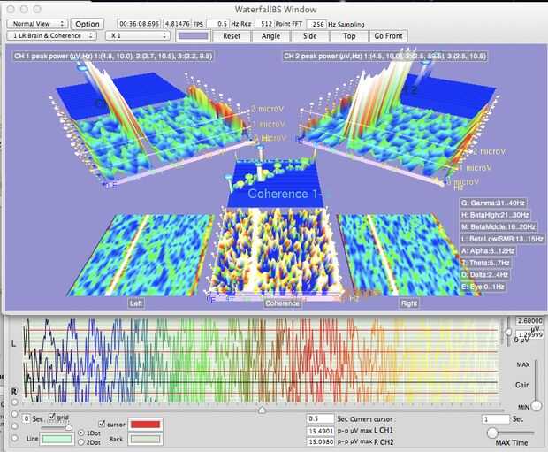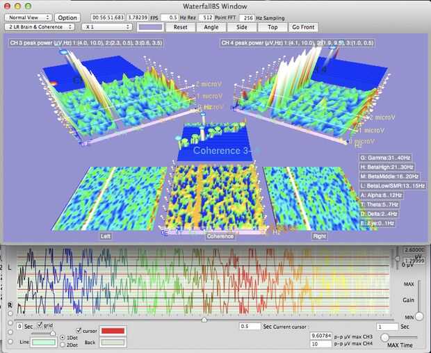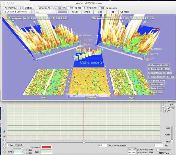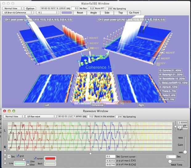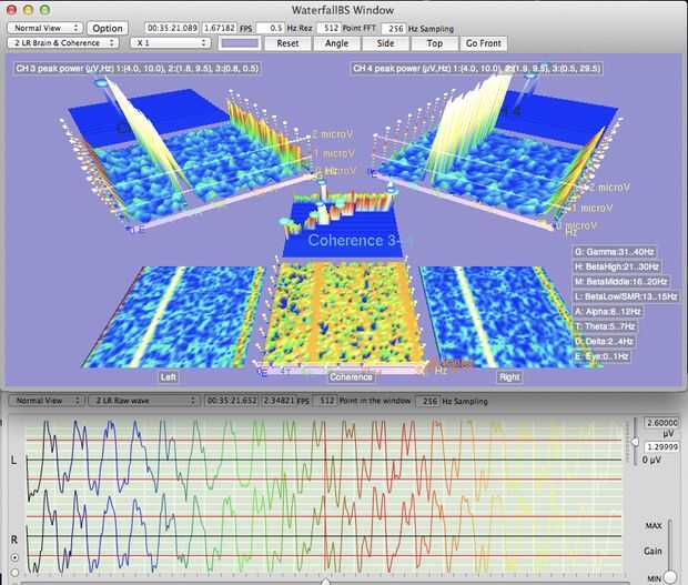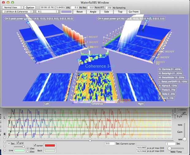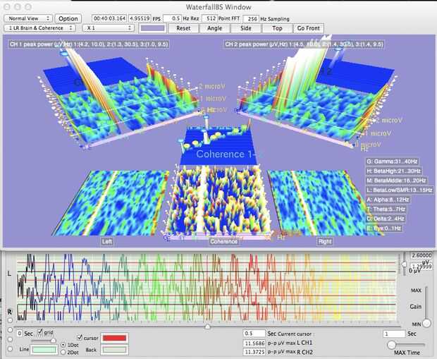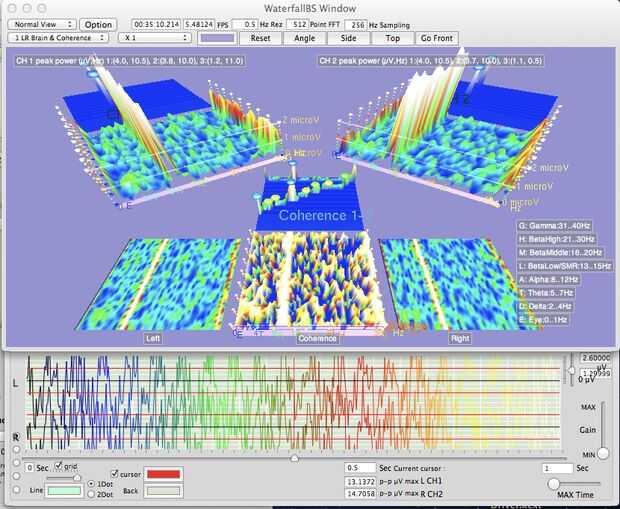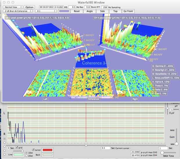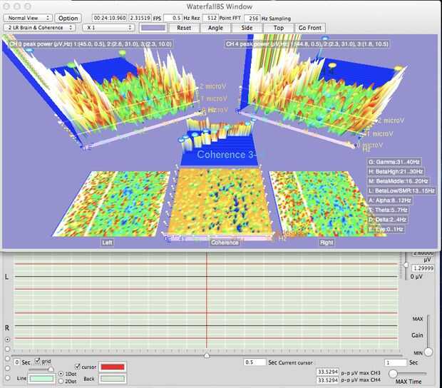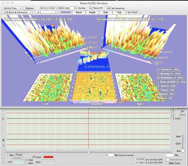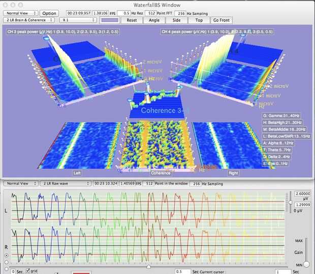 IBVA aplicación para mostrar el espectro 3D, 256 Hz de muestreo, 512 puntos FFT, corte alto a 40 Hz, Mostrar wav raw. establecer el aumento máximo X 10. podemos ver el espectro de par de menos de 0,1 micro V con esta configuración. tal vez para la mayoría de la gente no es tan importante este ruido.
