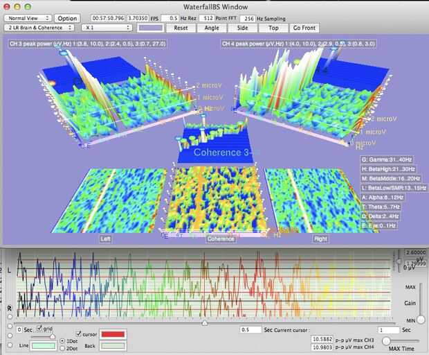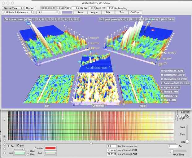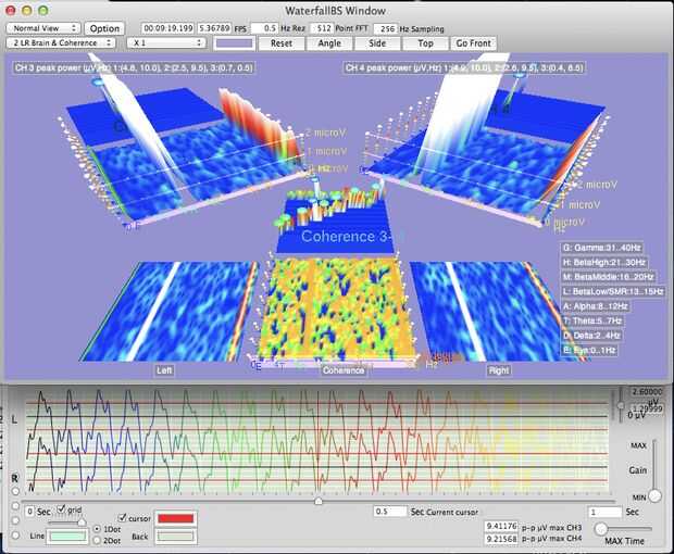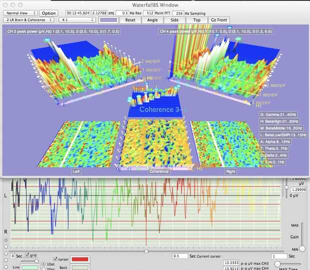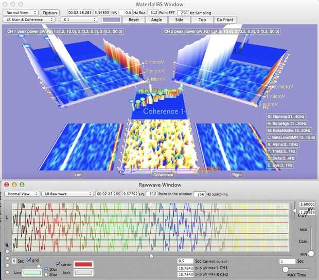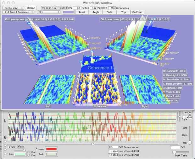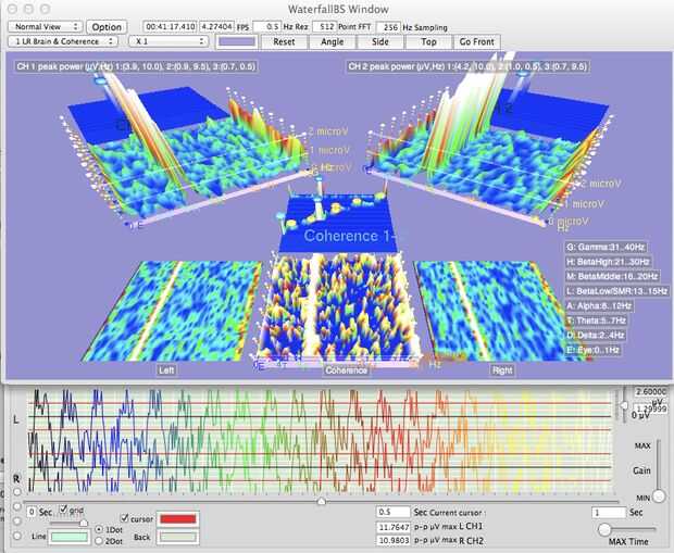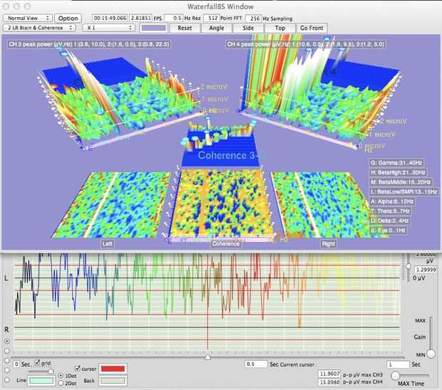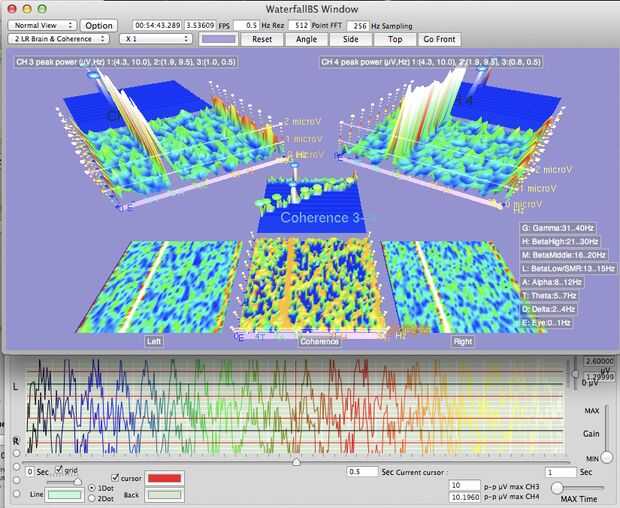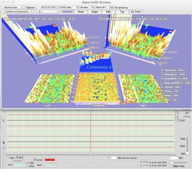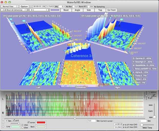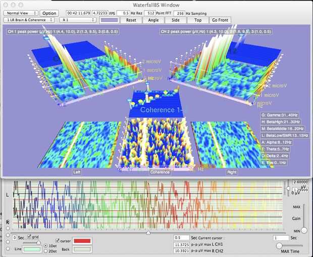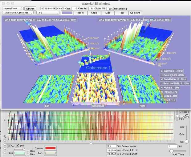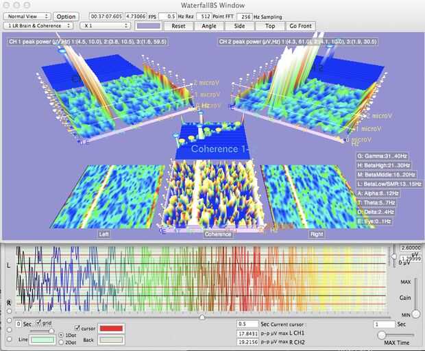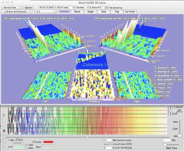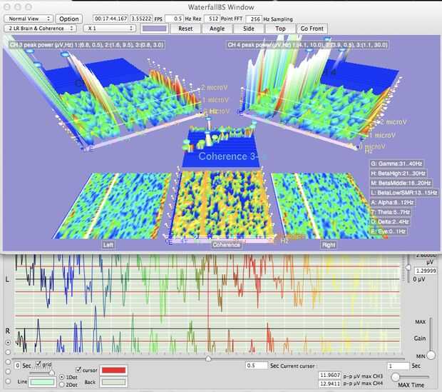 IBVA aplicación para mostrar el espectro 3D, 256 Hz de muestreo, 512 puntos FFT, corte alto a 40 Hz, Mostrar wav raw. establecer el aumento máximo X 10. podemos ver el espectro de par de menos de 0,1 micro V con esta configuración. tal vez para la mayoría de la gente no es tan importante este ruido.