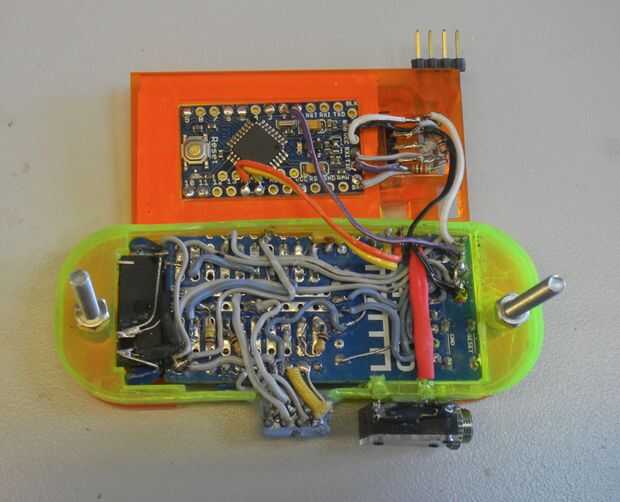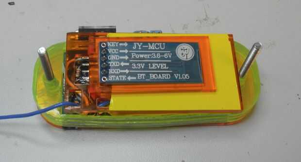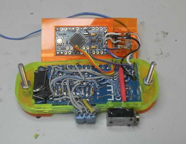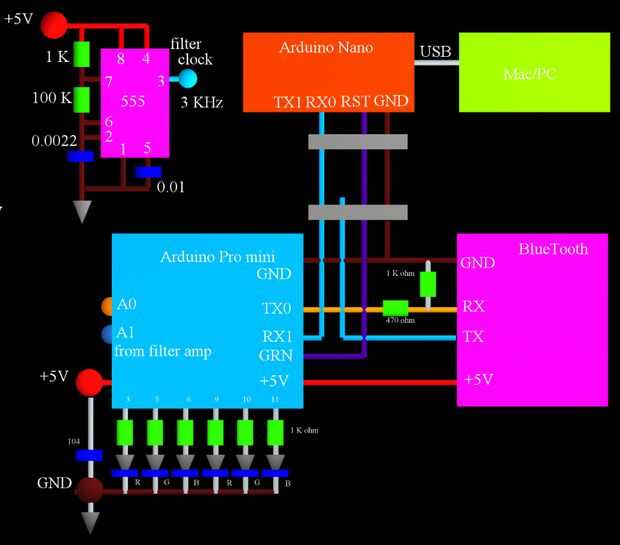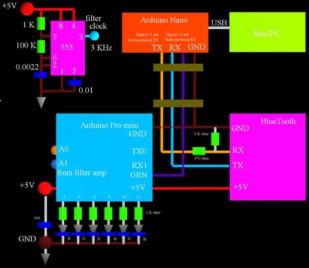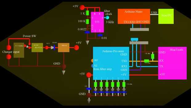 conecta dos salida de filtro para Arduino pro mini entrada analógica A0, A1 y filtro del reloj de entrada a salida 555, alimentación de 5V y GND de Arduino mini pro + Bluetooth.
