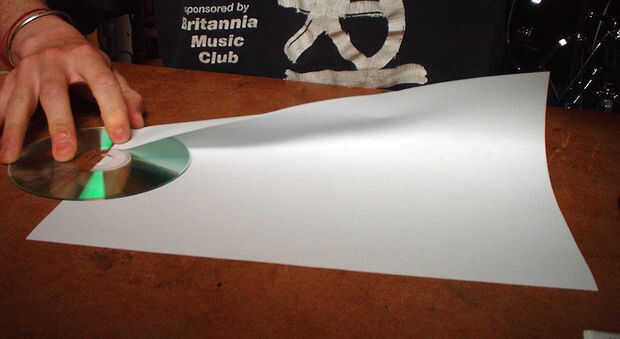 Tomar uno de los bordes más largo y doblarlo sobre en la parte superior del CD para que la esquina del papel se encuentra con la parte transparente en el centro de la CD.
