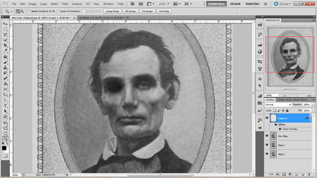 Ahora, en la capa que hemos copiado el ojo de, utilice la herramienta a oscurecerse y desvanecerse la imagen en la nueva capa. Esta configuración le da un montón de opciones. Decidí hacer los nuevos "ojos" de Abe ligeramente más bajo que los originales.