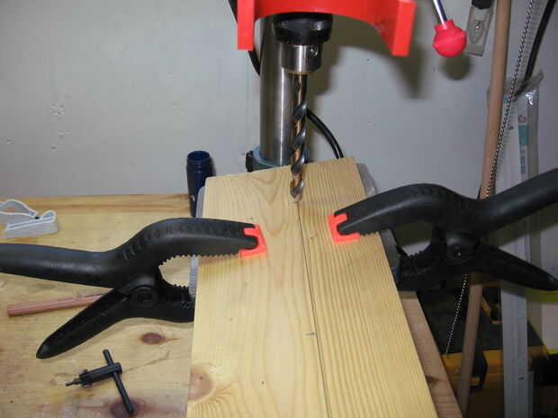 Ajustar la cubierta del taladro por lo que se inclina en un ángulo ligero. Elegí 10 grados. Luego fije con abrazaderas la placa en lugar con poco directamente sobre el primer agujero del pasador. Perfore el agujero.