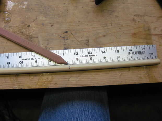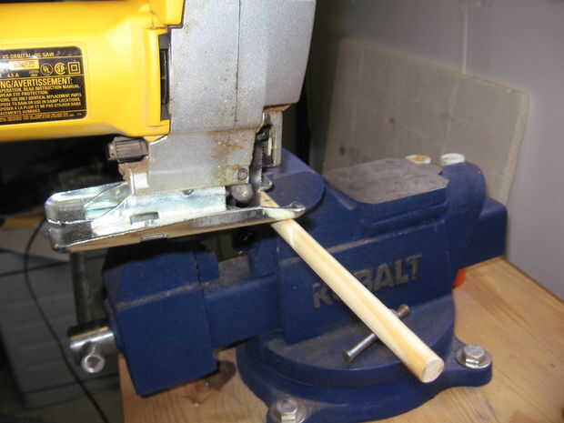 Ahora tenemos que preparar los tacos. Elegí una longitud de 6.5" b y c que quería los tacos para proyectar unos 6". He marcado de la espiga y había asegurado en mi tornillo de banco. (Nota mi Protector de trabajo de tornillo de banco para evitar que los tacos están marcadas [que me di cuenta que son oscurecidas por la sierra]) Luego corté la espiga con mi sierra de calar.