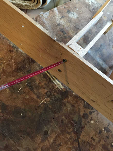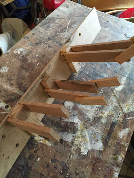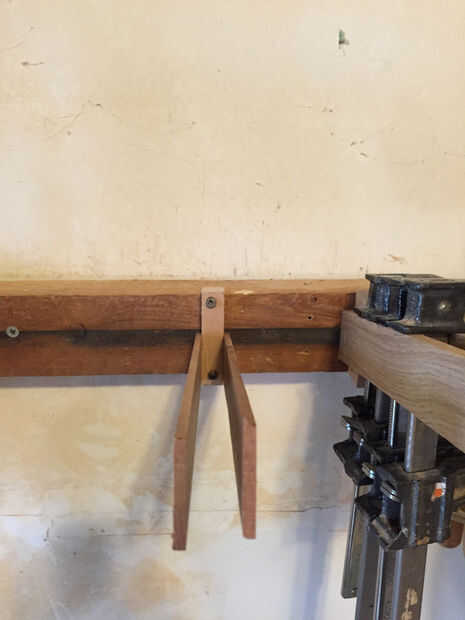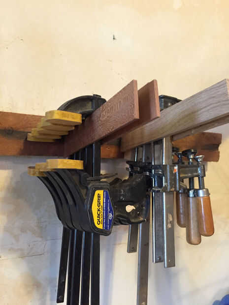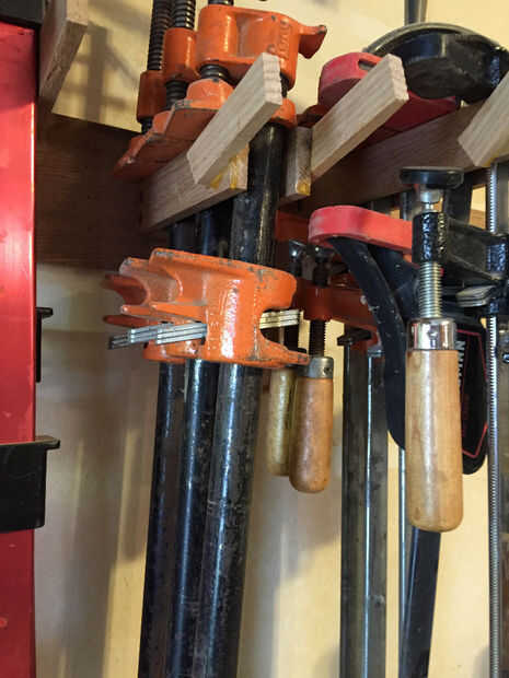 Primera imagen muestra una de las calas que se atornillan en un 2 x 4 a mi muro. Esto es un pedazo de madera arrancado al grueso de mi mordaza de agarre rápido, entonces simplemente pegados algunos madera fina a los lados y atornillados la Cala 2 x 4 Este proceso se repite muchas veces.