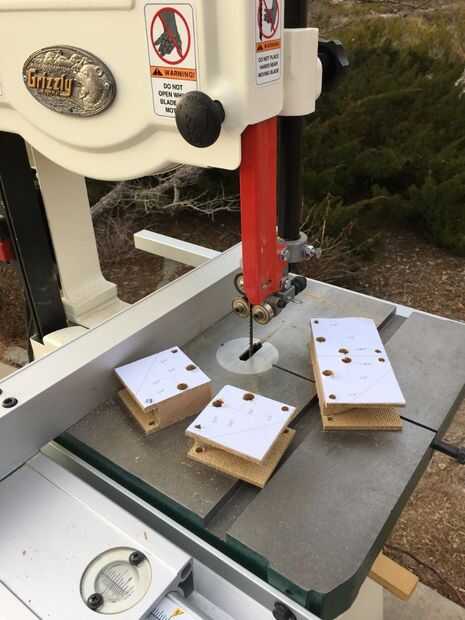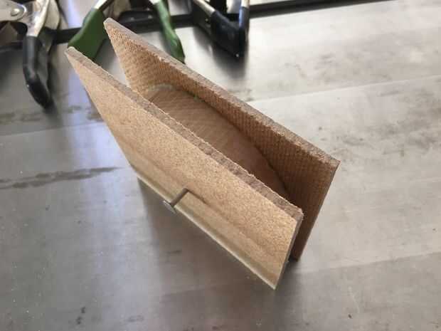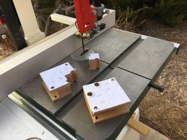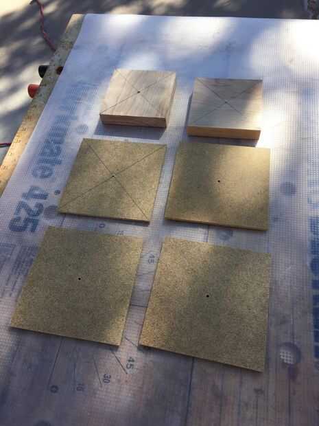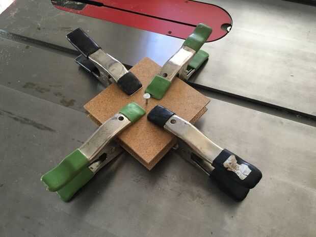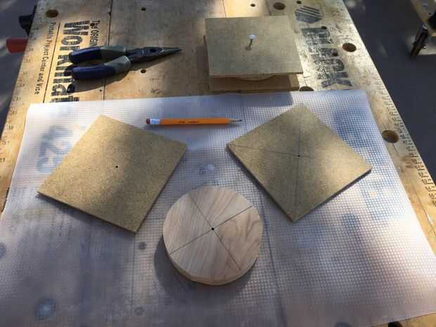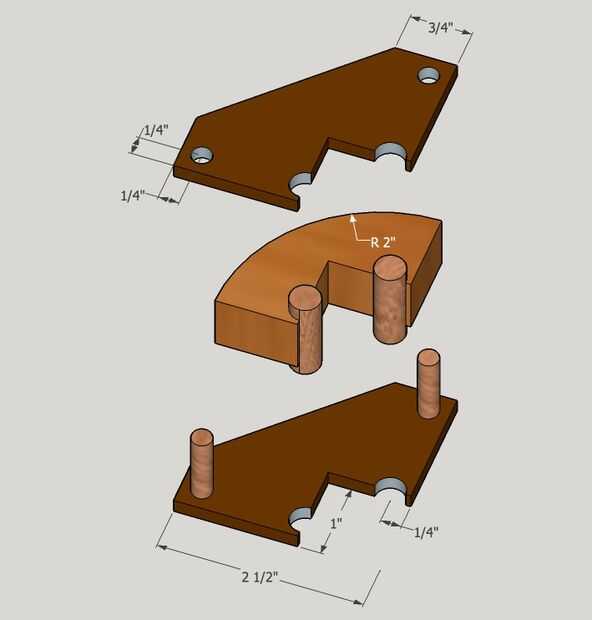 Para hacer estas mordazas de esquina, corte un círculo de diámetro de 4" de ¾" de la madera dura. Perfore un agujero de 1/8" a través del centro. Cortar dos 5" por 5" cuadrados de 3/16 (espesor real es inferior a 3/16") de madera y también Perfore agujeros de 1/8" a través de sus centros. Uso las uñas a la línea de los centros de madera prensada con el círculo de madera y pegamento el bloque junto. Los bordes de madera deberán estar alineados como se muestra en las fotos.