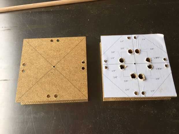 Después de que el pegamento se seca, imprimir y recortar la plantilla de taladrado 1 y palillo en el bloque cuadrado con pegamento de caucho. Luego perforar el ¼" y 3/8" como se muestra a través del bloque.