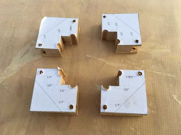 Cortar ocho 1-1/8" largo de una espiga de madera dura de 3/8". Utilice un pasador de roble; pino o álamo es demasiado suave. Pegar estas piezas de espiga en los 3/8 pulgada diámetro medio-agujeros. Los tacos funcionará como 'giratorias' garras para sujeción de las articulaciones que no en 90 grados.