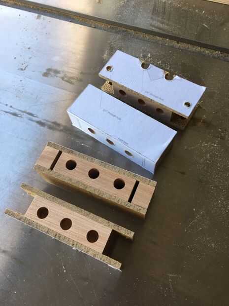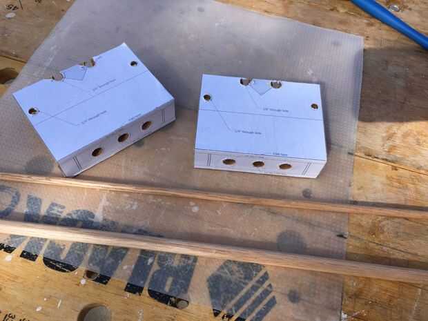 En la ranura de la Sierra de la venda hacia fuera de la quijada fija, cortando a través de los orificios de 3/8" como en el paso 1; Luego corte el bloque por la mitad a lo largo de la línea indicada en la plantilla. Marca las dos piezas en cuanto a cómo van juntos, realmente desea que los orificios laterales a la línea para arriba! Ahora tienes la quijada fija y el móvil deslizante para la tensión.
