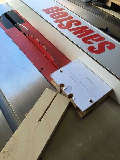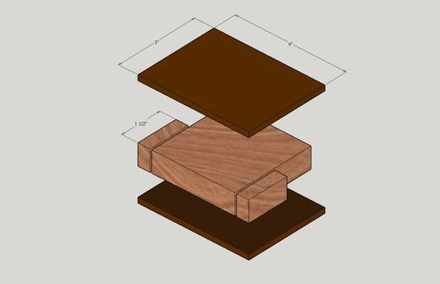 Empezar con 3" por 4" pedazo de ¾" de madera. Recorte ½" en cada lado a lo largo de la dimensión 4". Cortar una de las piezas cortadas por la mitad - uso la mano o sierra de cinta sierra, su demasiado pequeño para la mesa! Va a utilizar estos tres pedazos de madera ¾": una sola pieza de 3" por 2-7/8"(dependiendo del corte de la hoja de Sierra de mesa), y dos piezas ½" por aproximadamente 1-1/2".