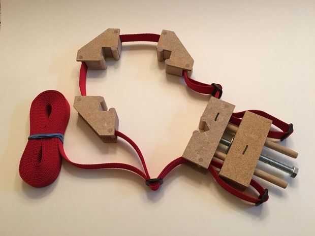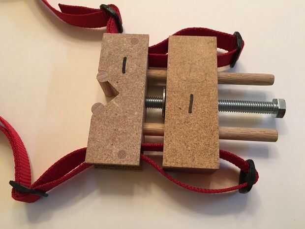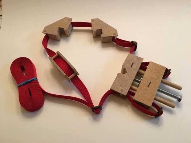 Conseguir un pie de 10 (o más, hasta el infinito) longitud de ¾" pesada ancho correas de Nylon (la banda) y cuatro ¾" triglide hebillas. Pase las correas a través de una hebilla, el lado izquierdo de la quijada fija, otra hebilla, luego a través de la ranura izquierda de la corredera móvil, el lado izquierdo de la quijada fija, el primer cierre y tres mordazas de esquina. Completar el mismo arreglo en el lado derecho. La demostración de los cuadros cómo su hecho.