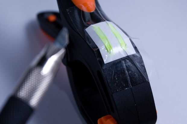 Cortar este papel y pegarlo a la abrazadera con un poco de cinta adhesiva transparente, luego empujar a través del papel a lo largo de los bordes de sus huellas con un pin o una cuchilla para hacer marcas.