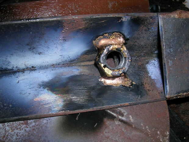 Una vez que la estructura fue soldada juntos taladré un agujero en el ángulo de montaje del eslabón giratorio de la lámpara. El eslabón giratorio era un hilo de rosca fina m12 y tenía sólo tuercas de rosca de curso en la acción, pude retroceder el giratorio a M12.