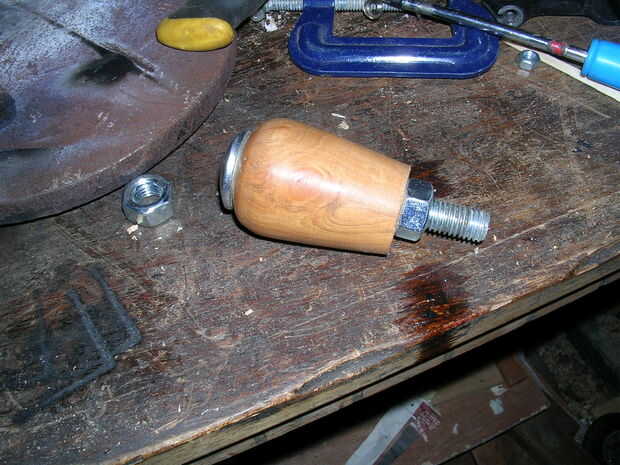 Una vez que la manija fue separada del espacio en blanco que había arreglado para arriba en la lijadora y el taladrado un agujero de 12mm a través de él para fijar el perno cuadrado de copa.