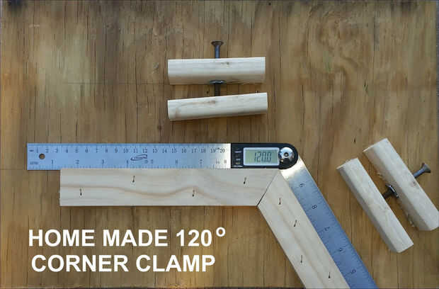 ¿Las abrazaderas de esquina comercial son ideales para esquinas de 90°, pero lo que si intenta pegar un cinco, seis o 8-echó a un lado del marco? Si usted puede encontrar una pinza para hacer esto, te costará una fortuna. Con una sierra de mesa o sierra para cortar ingletes, un poco de madera, pegamento y unos tornillos, usted puede rápidamente hacer su propio por muy poco. Estoy mostrando un par de fotos de una abrazadera de la esquina de 120° que hice para una gran caja hexagonal de sombra que quería. (El medidor de ángulo digital se muestra es muy útil para el trabajo de inglete de casi cualquier tipo. Son alrededor de $20-25 en Amazon.com pero probablemente disponibles otros lugares demasiado.)