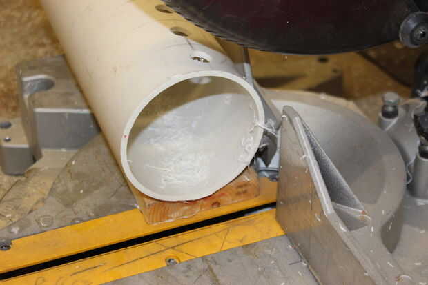 Tubería de desagüe tiene uno quemado "bell end", lo que le permite adaptarse a lo largo de la próxima. Si el tubo tiene un "fin de la campana", es más fácil cortar primero. Con seguridad puede hacer esto poniendo algo debajo de la pipa y contra la guía de la Sierra de inglete como un separadores. Esto mantiene el extremo de su plaza de la pipa.