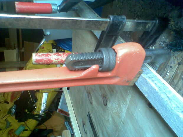 Ahora Coloque la llave de pipa en junto a la pinza con las mordazas a cada lado. Si usted no quiere marcar la madera y luego poner unas maderas de embalaje entre los tarros y los proyectos antes de entonces la bobina las mandíbulas cerradas.
