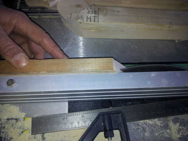 Este trabajo lo hice en la Sierra de mesa, pero puede ser manipulado por la Sierra de vaivén o con la mano Sierra, y honestamente, incluso no molestaba para medir lo que estaba quitando. Simplemente ajuste a la guía de la sierra a la mitad del ancho de la madera (dejando la consideración para el grueso de la hoja) y corte a través de uno de los ángulos de la 'C' hasta la hoja llegado justo por debajo del borde superior de la madera.