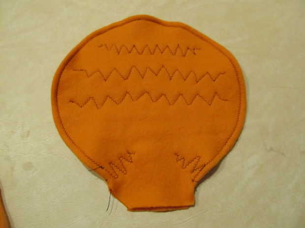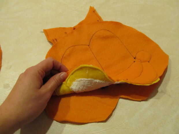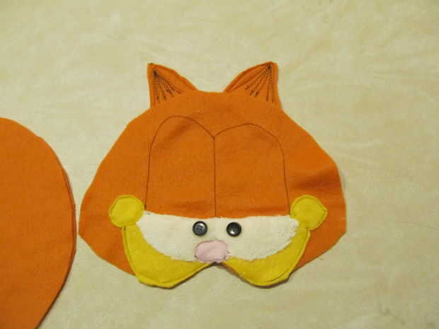A continuación usted puede diseño su cara usando la chatarra de fieltro o paño grueso y suave. Usted puede tener la cara de la pieza principal (como abuelita) o en la pieza de campana (como garfield). Trabajando en una de las capas a colocar los detalles de la cara simplemente cosiendo encima de ellos con una puntada recta como cerca del borde como sea posible. (Sería genial tener una máquina de bordar para esta parte ~ wink, wink)
