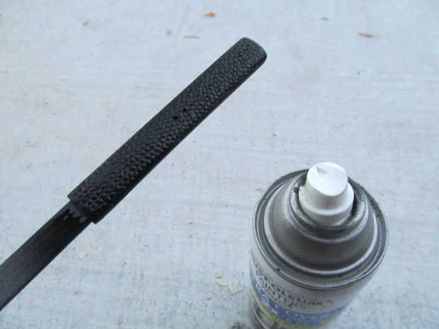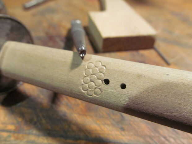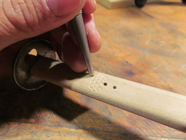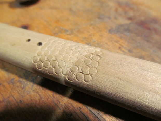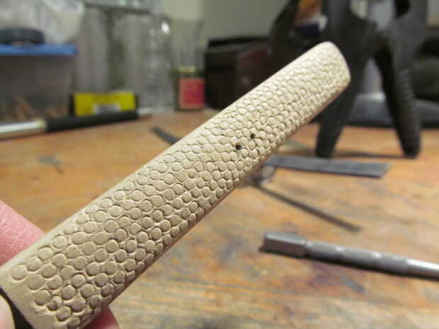 Sting ray piel es lo que se supone ir a lo largo de la manija, pero estaba fresco hacia fuera. He modificado un conjunto de clavos para acabar con los círculos en la madera. Luego tiene una capa de pintura negra.