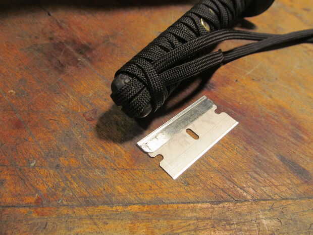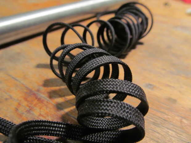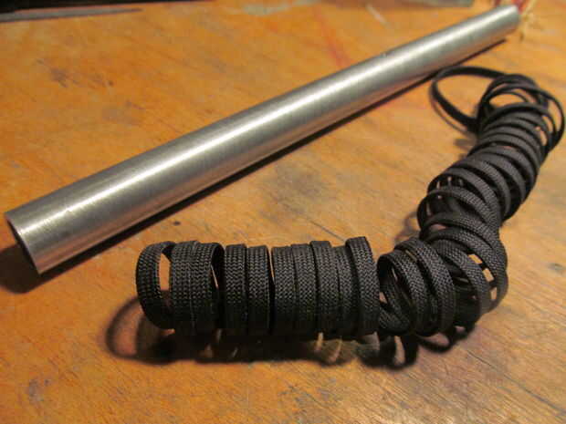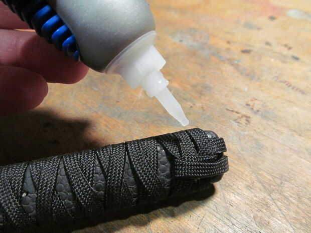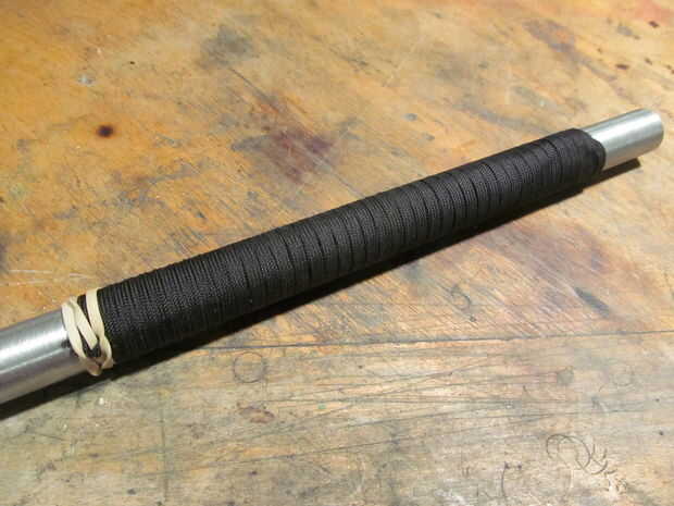 Another good use for paracord. Para ayudar con este paso yo primero envuelto paracord destripado sobre un tubo y dejar que fijó durante la noche. Cuando desenrollado es agradable y plana. Yo entonces envuelto x hacia adelante y hacia atrás la manija en el suelo. Esta no es la envoltura tradicional pero aún funciona bien. Para mantener en su lugar utilicé pegamento de cena.
