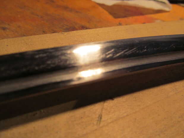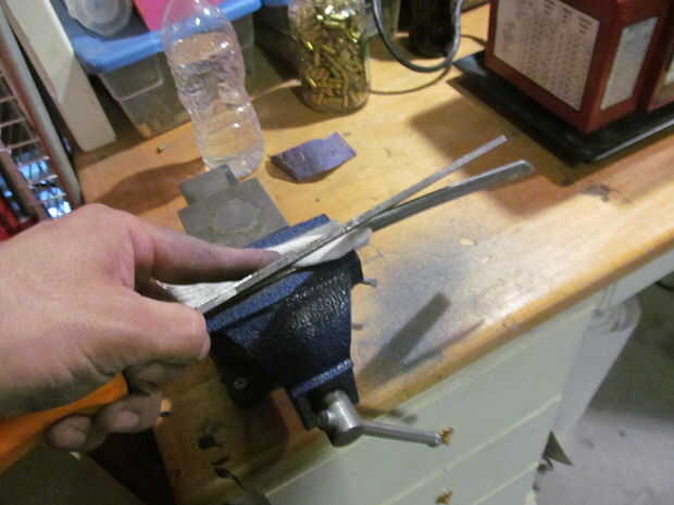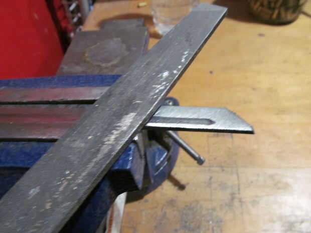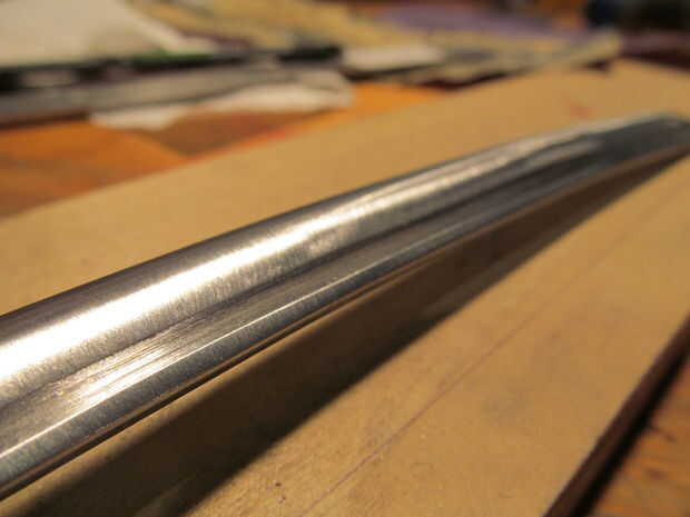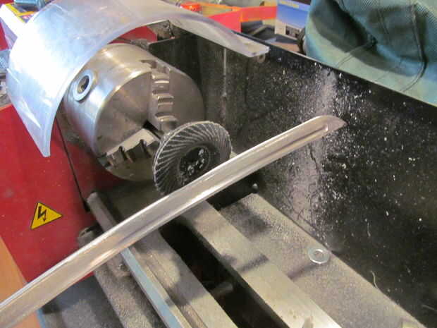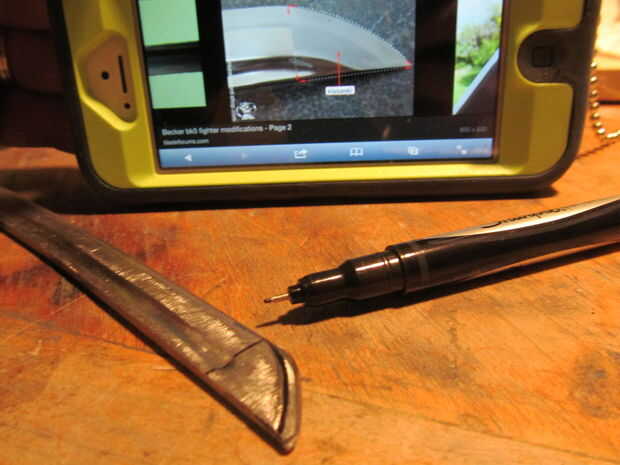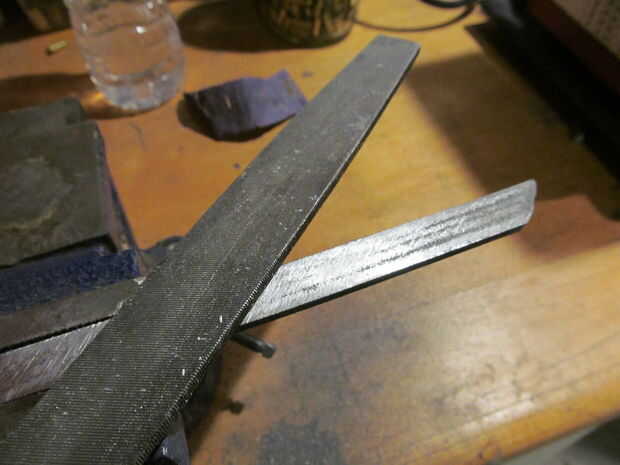 A flap wheel was a huge help in shaping the blade. Usé y archivos para crear el borde. Me doy cuenta ahora que no tomo fotos de la parte posterior de la hoja pero esto es donde yo hubiera enarenar hacia fuera las marcas dejadas por la prensa. He dejado deliberadamente las marcas en. La parte posterior de la hoja se utiliza para guardar y marcada encima de la batalla. Pensé que añade carácter.