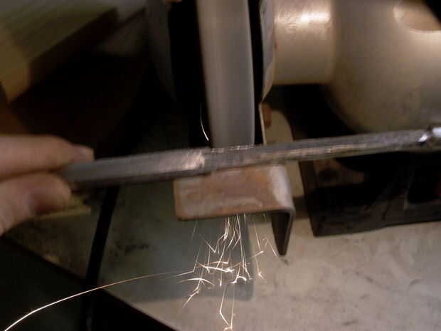 * (ver tercera imagen) Mantenga el metal para que se agarre la parte plana de la hoja y moler el tang moviendo hacia adelante y hacia atrás empezar a quitar el metal para crear un lado plano.