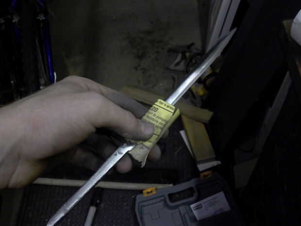 * Mantenga la espiga en su mano no dominante y con la mano dominante sostenga un trozo de papel de lija (grano 100) y dóblalo por la mitad sobre el borde de la hoja y arena arriba y abajo de la longitud de la hoja hasta que no vea rasguños de la etapa de presentación y se obtiene un nuevo conjunto uniforme de líneas. Ahora tomar una pieza fresca y doblar encima el otro borde y repetir.