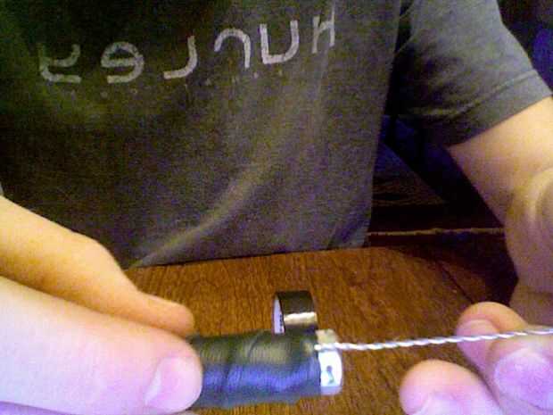* Coloque el extremo doblado en las pinzas y el otro en la prensa la uniformemente tuerza el alambre hasta que se asemeja a la de la imagen de abajo.