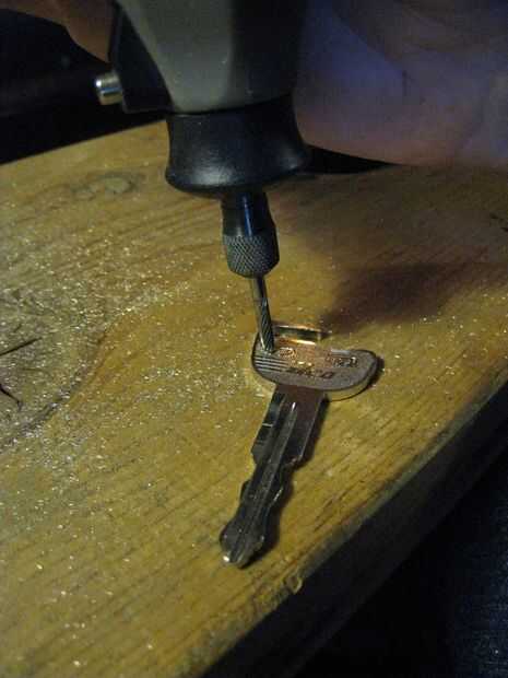 También, pensar acerca de qué lado quieres las llaves para pasar de (mientras se está abriendo una botella y mientras usas la tecla). No quiero las claves de tirarse encima de la botella, por lo que había perforado el agujero en el mismo lado que el diente. Las teclas de colgar muy bien por el lado de la botella.