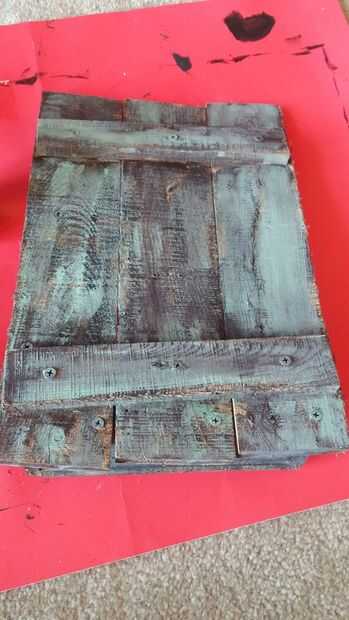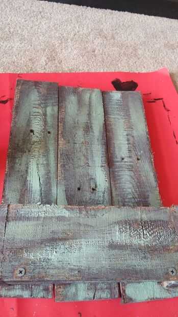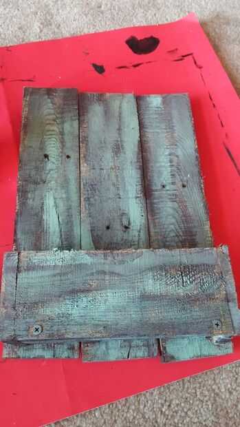 después el marrón seco en su mayor parte, mezclé el amarillo y marrón, azul y blanco para hacer un color verde mar. He añadido una cantidad considerable de agua a la mezcla antes de aplicar a la madera. utilizando la misma técnica (poca pintura en el pincel y pinceladas) añadí la capa verdosa. después de que seca, ligeramente he añadido una capa más ligera de un verde más brillante con menos agua mezclado. Dejo este seco antes de continuar con la inscripción