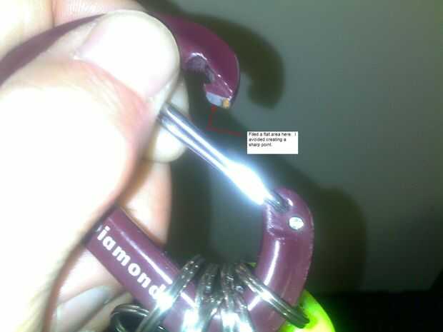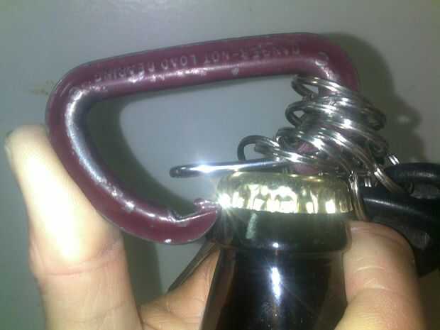Estaba en una tienda REI y notó un pequeño diamante negro Funbiner , que es un aluminio, muros de carga no, carabinero que es aproximadamente 2/3 del tamaño de un mosquetón de escalada normal. Me di cuenta de que el Funbiner tenía casi la forma correcta en esa misma zona para alzaprimar una tapa de botella. Pensé para $3,50, merecería la pena experimentar. Presentar un pequeño punto plano en el área de forma de gancho para permitir que se deslice un poco más debajo de la tapa, pero no tanto como para afectar la función de cómo la puerta se cierra contra esa zona o para crear una zona aguda que puede llevar a mi bolsillo. Ver la segunda imagen. La pequeña área sin pintar es todo lo que tenía que limar para conseguir que tome la parte superior de la botella.
