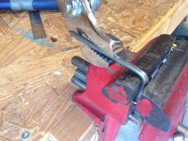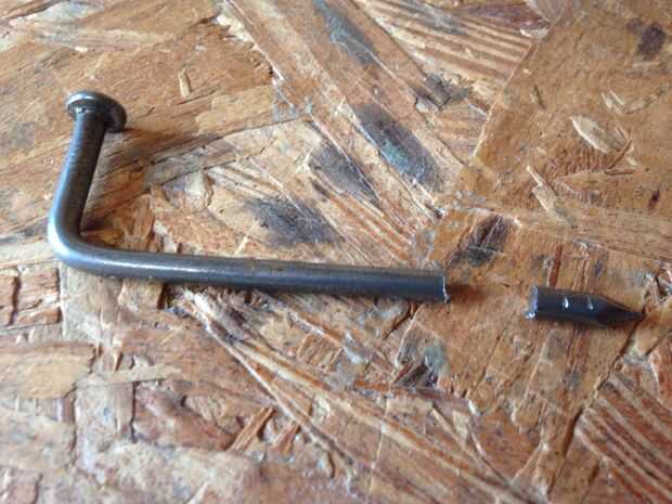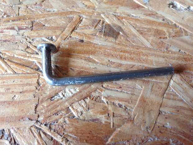 empecé marcando donde debería estar el clavo y donde debe doblar. Luego ponerlo en la prensa y había doblado en un 90deg. con una llave. Tomó un par de intentos para obtener la curva justo donde lo necesitaba. Entonces yo cortar la punta para quitar parte de la longitud.