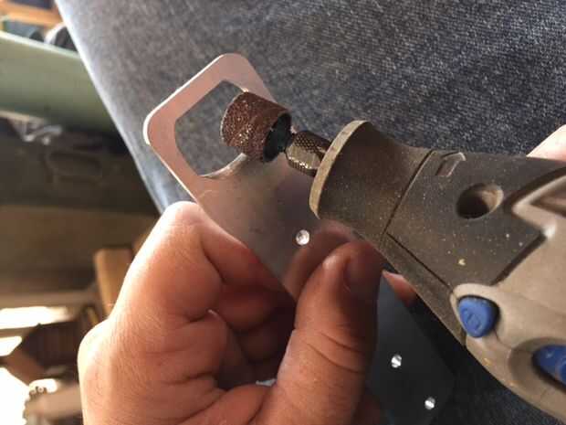 hice mi papá un abrebotellas para su cumpleaños.  Tuve un gran pedazo de aluminio fino ahí, así que asierra hacia fuera un rectángulo y luego archivado abajo el metal a la forma correcta.  Las líneas fueron hechas usando clips martillados en el alumi