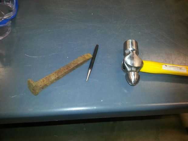 Hay un par de maneras de perforar un guidehole, pero la mejor manera es hacer la espiga en su lado (recuerda que la cabeza de la espiga asegura que no puede poner plana sobre una superficie horizontal, como su mesa de trabajo) y a mano alzada el golpe. Ciertamente, puede chuck la espiga en un tornillo de banco, pero que realmente no es necesario. Esto no es un guidehole de precisión, y siempre y cuando te las arreglas para estar cerca de su destino punto, debe estar bien.