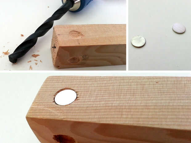 Abeto seco los imanes en las aberturas, si vas un poco más profundo de lo que pretendíamos que fácilmente pueden utilizar las virutas de madera para golpear los imanes hasta la altura correcta. No decidí instalar los imanes hasta que el perfil fue definido (en el paso siguiente).